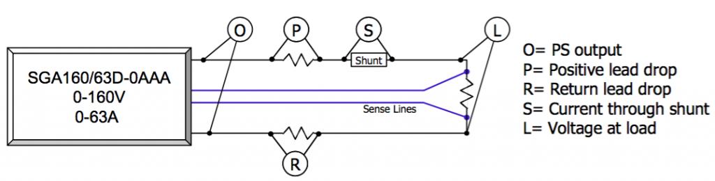 To achieve the highest level of load regulation, the SG Series has remote sense capabilities. Remote sensing allows the supply to measure the voltage directly across the load. It then uses this value to regulate the power supply output. The result is a regulated voltage at the load that's independent of any load line drops. SGA Series voltage regulation specifications apply for line drops of up to 10% of full-scale voltage on 40V to 100V models and up to 4% of full-scale voltage on 160V to 600V models.