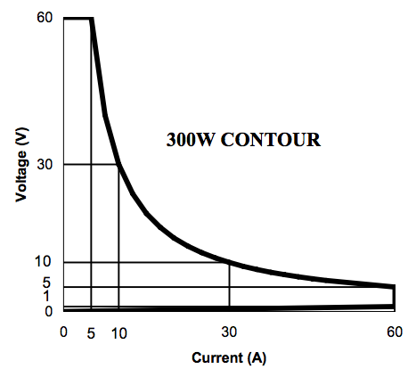 A very similar curve is the power contour of the electronic load. In practice, the power contour curve of an electronic load shows how much current that a load can sink at various voltages when programmed to their maximum power level. The figure below shows the power contour for a Sorensen SLM 60-60-300 Electronic Load. It has a maximum input voltage of 60 VDC, a maximum input current of 60 A, and a maximum power capability of 300 W.
